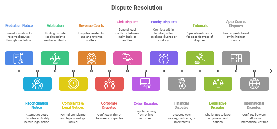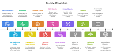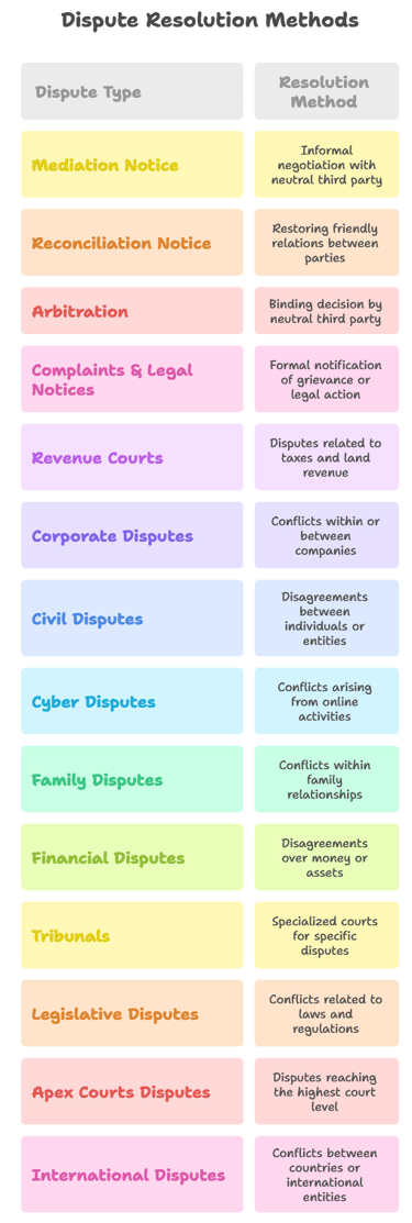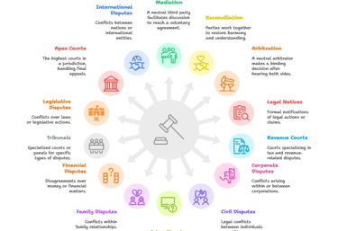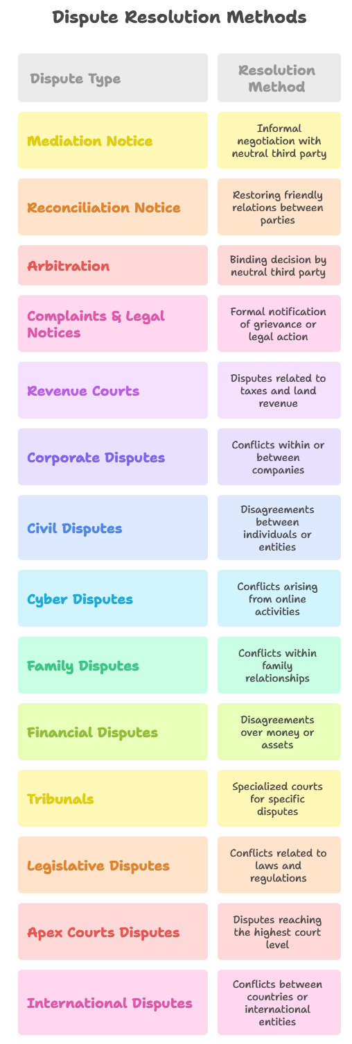 Dispute resolution aims to settle conflicts peacefully and efficiently, using both judicial and alternative approaches. Common methods include: